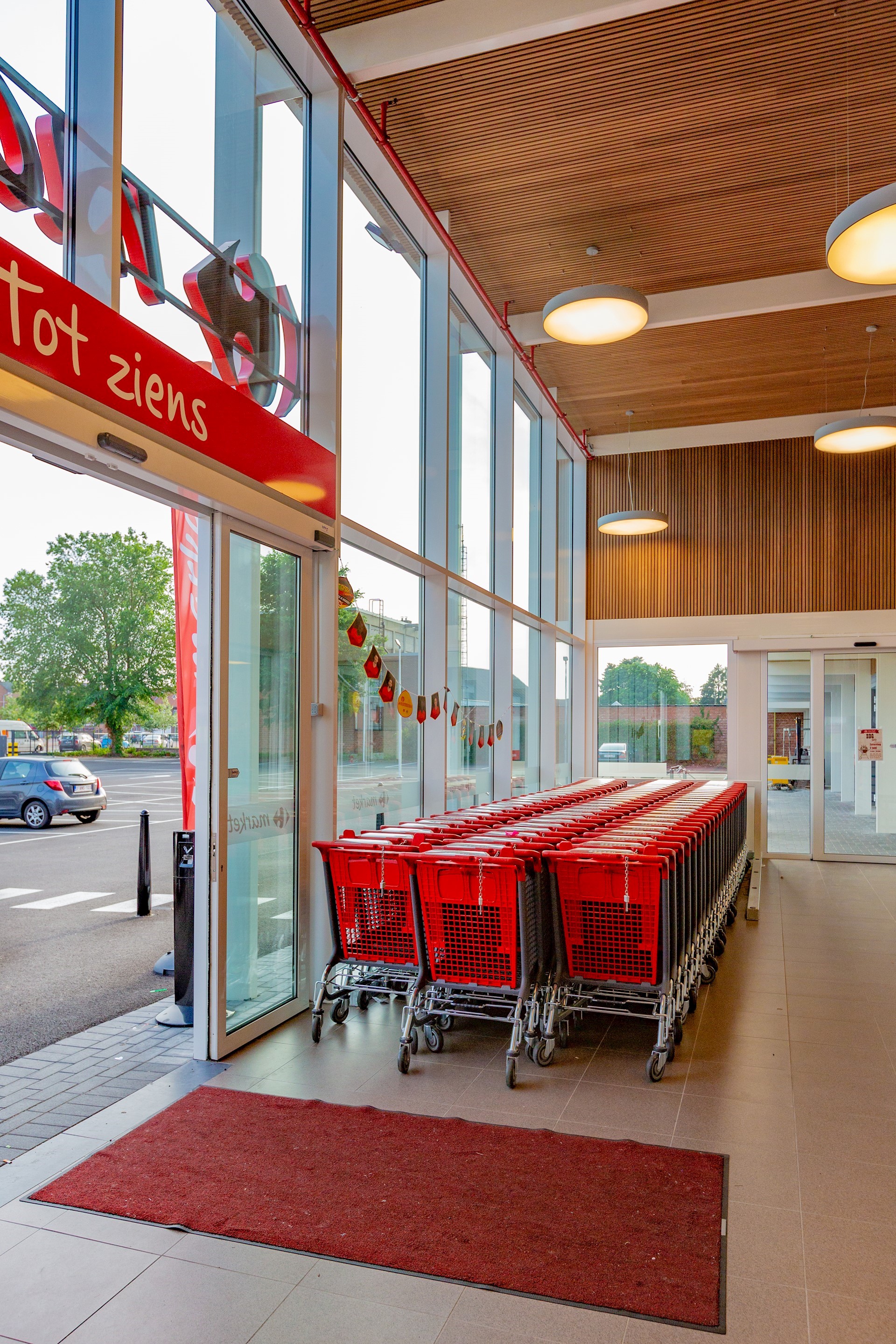 Bij de verbouwing van deze bestaande Carrefour werd er een nieuwe front/luifel voor geplaatst om de winkel de nodige nieuwe facelift te geven. Er werd gekozen om de onderkanten van de luifel te bekleden met hout voor een warmere uitstraling. De luifel werd ook doorgetrokken naar de naastliggende kleiner winkels om op deze manier één geheel te vormen.